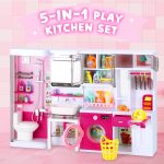 4-in-1 Mini Bathroom Playset – Toy bathroom set comes with 4 parts including shower room, dressing table, laundry room, ironing room and lots of imitation bathroom supplies. All-in-one pink bathroom toys for girls who like to pretend play with dolls, much more to provide endless hours of fun.