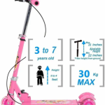 Draped in a beautiful blue pink red green colour, the scooter features 3 wheels to add stability. It comes with an adjustable handle that can be raised or lowered to match the child’s height. Its lightweight frame makes it easy to carry around and a folding design makes it convenient to store. The scooter offers a healthy exercising alternative